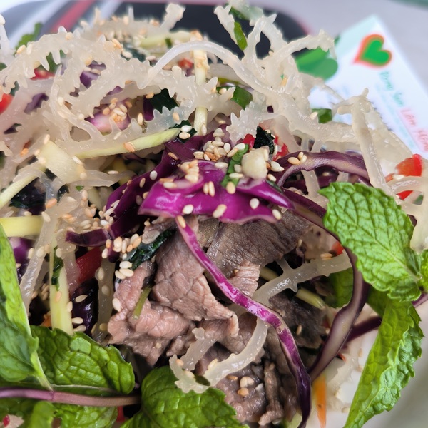 Salad rong sụn xoài xanh có độ giòn sần sật, vị chua thanh dịu, giúp kích thích vị giác và mang lại cảm giác tươi mát, rất thích hợp trong những ngày oi nóng.