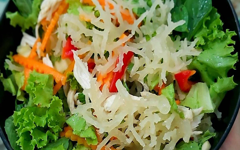 Nếu bạn đã quá chán với món gà luộc thông thường thì sao không thử đổi khẩu vị với món salad rong sụn. Nguyên liệu chủ yếu là rong sụn cùng rau xà lách thêm chút rau thơm, dưa chuột, trứng tráng, giò chả nếu có là bạn đã có thể bắt tay vào làm món ăn này rồi. Nếu bạn đang ăn kiêng hoặc trong quá trình giảm cân, ngoài nước sốt chua ngọt, bạn cũng có thể thay thế bằng sốt sữa chua hoặc sốt giấm cũng vô cùng tuyệt vời.